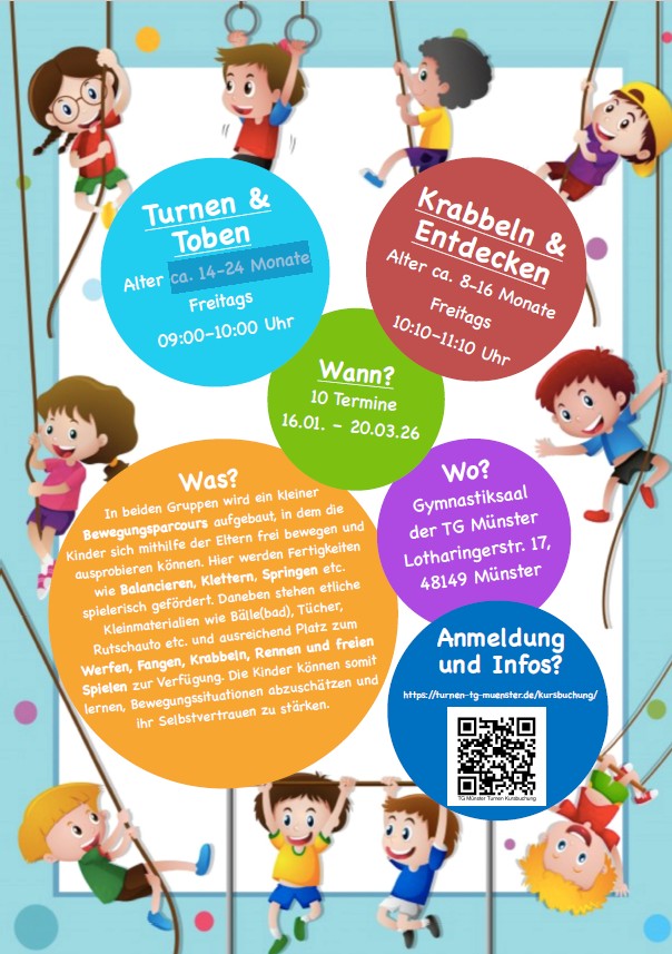 Neue Grundmotorikkurse für Kinder zwischen 8 und 24 Monaten starten wieder ab dem 16.01.2026 (Anmeldung ab Samstag, 20.12.2025, 12:00 Uhr). Bis zum 20.03.2026 finden die Kurse jeden Freitagvormittag an der Lotharingerstraße statt. Weitere Informationen zu den Kursen und zur Anmeldung finden Sie hier auf der Website sowie auf folgendem Plakat.