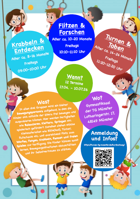 Neue Grundmotorikkurse für Kinder zwischen 8 und 24 Monaten starten wieder ab dem 17.04.2026 (Anmeldung ab Samstag, 21.03.2026, 12:00 Uhr). Bis zum 10.07.2026 finden die Kurse jeden Freitagvormittag an der Lotharingerstraße statt. Weitere Informationen zu den Kursen und zur Anmeldung finden Sie hier auf der Website sowie auf folgendem Plakat.