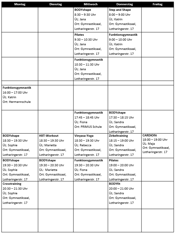 In der ersten Herbstferienwoche vom 13.10. bis 17.10. konnten wir ein abgespecktes Ferienprogramm zusammenstellen. In der zweiten Ferienwoche (20.10. bis 24.10.) können die Kurse leider nicht stattfinden, da der Sportraum wegen Reinigungsarbeiten geschlossen ist. Die Kurse Funktionsgymnastik an der Hermannschule montags um 16 Uhr und Funktionsgymnastik mittwochs um 17:45 Uhr an der PRIMUS Schule laufen allerdings weiter.